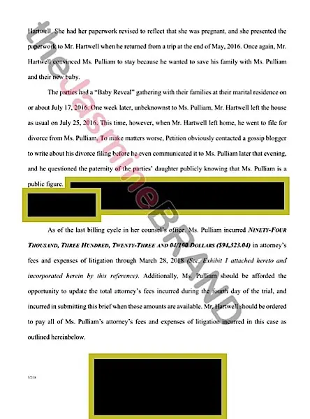As of the last billing cycle in her counsel’s office, Ms. Pulliam incurred ninety-four thousand, three hundred, twenty-three and 04/100 dollars ($94,323.40) in attorney fees and expenses of litigation through March 28, 2018…Mr. Hartwell should be ordered to pay all of Ms. Pulliam’s attorney fees and expenses of litigation incurred in this case…