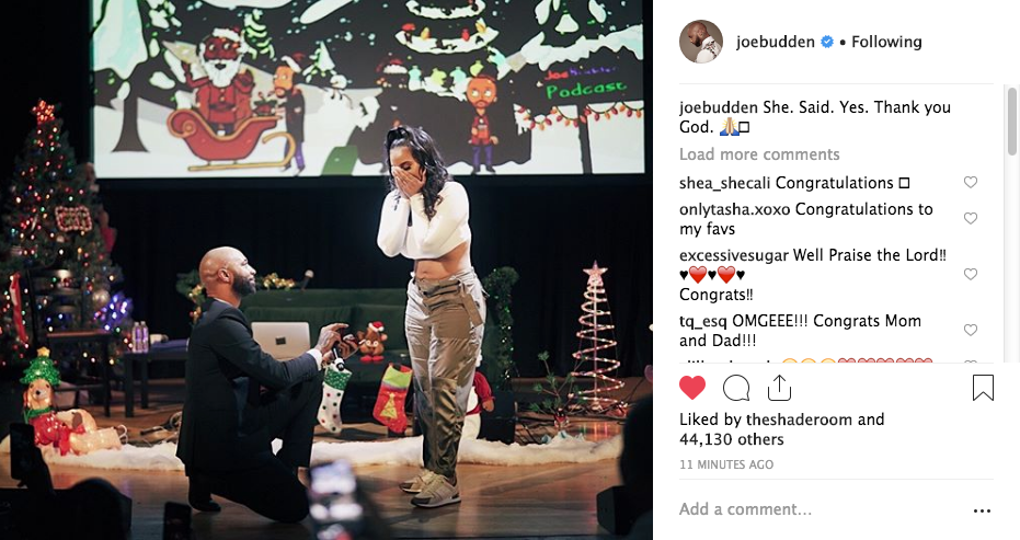 Congratulations to Joe Budden and Cyn Santana! Tonight the VH1 reality star and podcaster proposed to Cyn. The surprise proposal took place in front of a live audience. See the clip below.