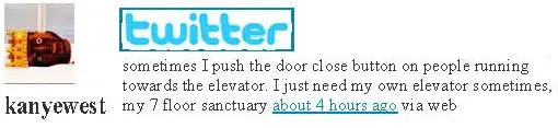 Today, I leave you with–>” sometimes I push the door close button on people running towards the elevator. I just need my own elevator sometimes, my 7 floor sanctuary” about 4 hours ago via web via Yeezy.
