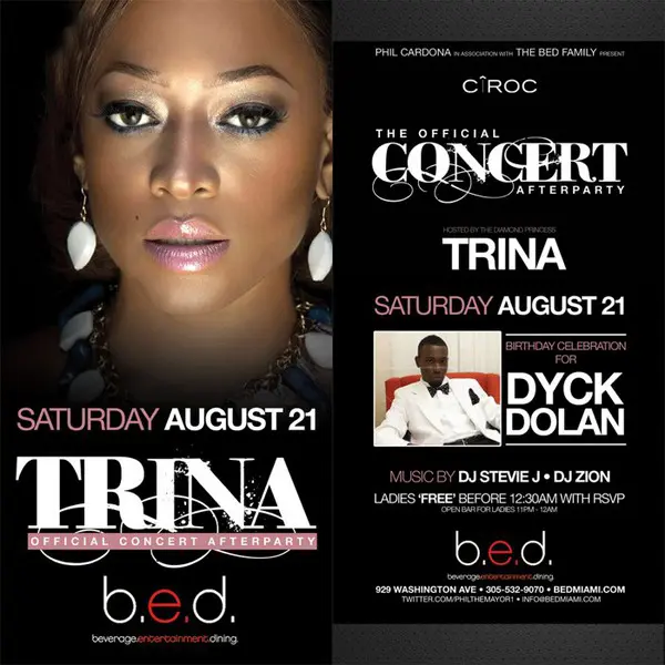 Dear Miami, Trina Hosts BED August 20, 2010 by Kellie Williams in Uncategorized with 0 Comments Trina host’s Miami’s club BED this Saturday. Holla at Phil the Mayor for the guest list & info. Tweet Like Plus Pin It Share Authored by: Kellie Williams http://thejasminebrand.com Previous ArticleNext Article Related Posts Jay-Z’s Original 40/40 Club in Manhattan Closes After 20 Years Floyd Mayweather Claims He Witnessed Tupac Shakur’s Death In Recently Resurfaced Video: ‘I Ain’t Never Told Nobody’ Lauren London Pens Heartfelt Message To Nipsey Hussle On 4th Anniversary Of His Death: I hold my breath all of March Comedian Jess Hilarious Says A Male Celebrity Thought She Was Transgender, Offered To Fly Her Out To Have Sex Social Media Influencer “Hushpuppi” Sentenced To 11 Years In Prison Over Money Laundering Conspiracy Kanye West, Jay-Z, Diddy, Khloe Kardashian & A Handful Of A-List Celebrities Received Millions In PPP Loans Brittany Renner Throws Water In Mans Face During Heated Verbal Altercation [VIDEO] NYC Male Photographer Receives Backlash For Charging $100 More To Shoot Plus-Size Models Leave a Reply Cancel comment replyYour email address will not be published. Required fields are marked *Comment * Name Email Website Δ
