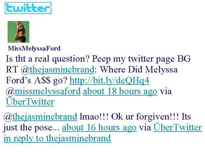I stand corrected, Melyssa Ford did not lose her a$$. After posting this, she called me out on it and explained that it was the way that she was posing. Peep her tweets below: