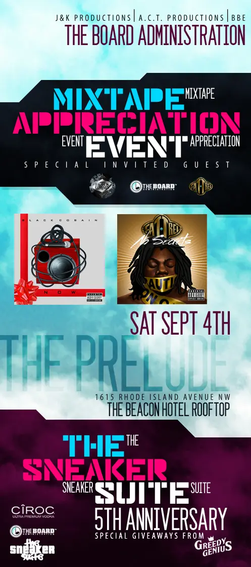 Besides duckin’ from Earl on Saturday, we hear e’rybody is going to be at the Beacon Hotel’s Rooftop. I’m told that all of the cool kids’ll be here + folks are celebrating Wale’s The Board Administration Mixtape Release & Sneaker Suite 5 year Anniversary Event. Holla at Sherm for more info.