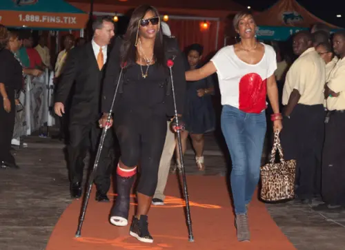 Serena Williams w/ a mean crutch swag & Kelly Rowland @ Miami Dolphins Game