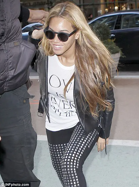 Beyonce was spotted out on the streets of NYC rocking some star-studded leggings. I love the flat ironed hair that she’s rocking. It looks as if leggings are here to stay.