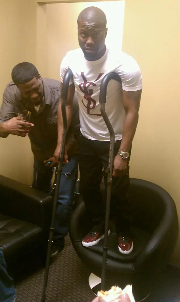 Comedian Kevin Hart can only seem to fit these crutches if he stands on a chair. They’re Greg Oden’s crutches, who recently attended Hart’s show.