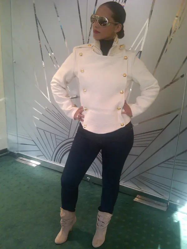 Alicia Keys, who was spotted last month with her hubby in St. Barts, strikes a pose in a hot white jacket.