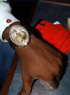 Luxist explains, “The real allure is in all the jewel work. Tiret claims it took them over five months to create the dial. The dial itself is in gold toned mother-of-pearl, with a combo of white, yellow, brown, and black diamonds. The bezel is lined with very large diamonds as well. The watch is said to have a total of about 8 carats of stones. Kayne’s face has been immortalized on the dial – complete with sunglasses. Retail price for this is said to be about $180,000, and is custom made specially for each client.”