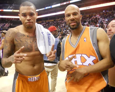 A shirtless Chris Brown and Common were spotted hooping in the celebrity shoot-out in Phoenix.