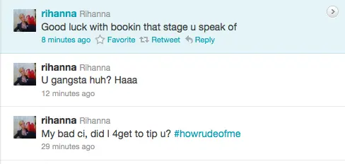 Rihanna tweeted: My bad ci, did I 4get to tip u? #howrudeofme U gangsta huh? Haaa. Good luck with bookin that stage u speak of. Ciara baby, I love u girl! U hurt my feelings real bad on TV! I’m heartbroken! That’s y I retaliated this way! So sorry! #letsmakeup