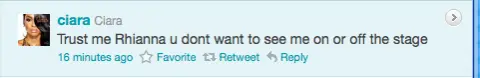 Ciara tweeted: Trust me Rhianna u dont want to see me on or off the stage. pure comedy…
