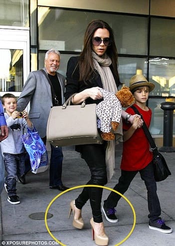 Rumor has it that 37-year-old Victoria Beckham is almost 7 months old, but one couldn’t tell by that mean shoe game that she’s maintained. She was spotted at LAX, returning from the Royal Wedding (the flight was 12 hours), wearing a pair of nude platform Louboutins. Wow, I bow down to her for that. Source