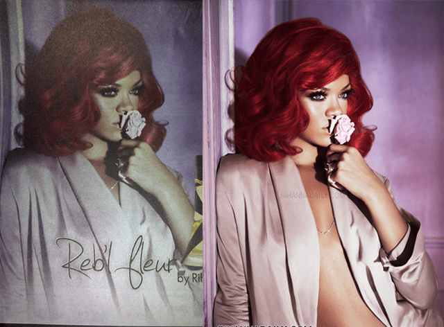 Kuwait is not a fan of all that cleavage that Rihanna is serving in her newly released debut fragrance, Reb’l Fleur (how in the hell do you pronounce that, anyway?). Apparently, an exposed chest is inproper, inappropriate and un-lady like. According to the before and after photos, it looks as if they Photoshop’ed some fabric on baby-boo.