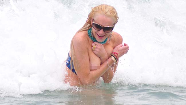 Lindsay Lohan accidentally lost her bikini top during a photo shoot for Plum Miami Magazine. It looks as if she attempted to cover-up, but one nipple was disobedient. Thanks to the Daily Telegraph, they’ve blurred it–good for them! I’m all nippled out, anyway.