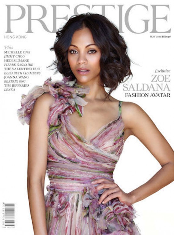 Wearing a Elie Saab couture gown, Zoe Saldana covers the May 2011 issue of ‘Prestige Magazine Hongkong.’ In the issue, Saldana discusses how she has added directing under her belt. “I’m working with my sister directing episodes for a pilot with Vin Diesel called “The Ropes,” about the lives of bouncers. We’re so psyched. I had the most amazing first day of shooting. I was on the set for 12 hours, went to bed at two am, was up again at 7.30, my energy and brain completely alert. I can’t wait to get back on set. After one day on set, I’m feeling the itch. I’m also directing a video short for Glamour magazine. And I’m in talks to possibly direct a film in Montreal, but I don’t want to say too much about that until it actually happens. Anything can change in this business.” Full interview here.