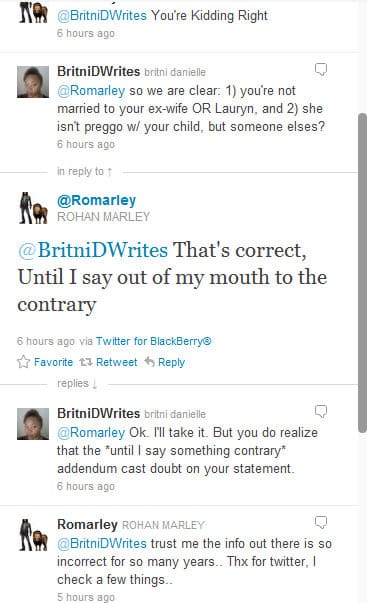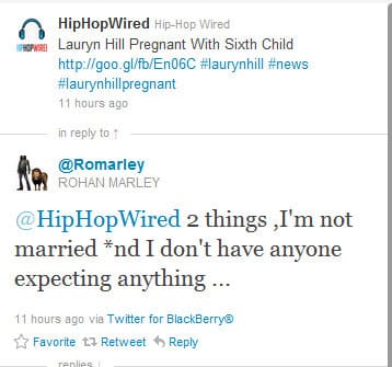 Compliments of Tattle Tailzz, we’ve learned of some alleged “Jerry Springer” type information that involves Lauryn Hill’s ovaries and an alleged baby-daddy-that-isn’t. As you know, over the weekend, Lauryn Hill announced that she is pregnant with her SIXTH child. I, along with the rest of the ovary hustlers out there ASSUMED that she was pregnant by her boyfriend/child of her other FIVER children, Rohan Marley. In the tweet exchange below, Marley refers to HipHopWired that he is NOT the father of Lauryn Hill’s future child.