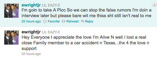 Friday, rumors hit that the son of late Eazy-E, Eric Wright Jr. (rap name Lil Eazy-E), had died in a car crash in East Texas. It turns out that although he was not involved in the crash, other people, one of whom was a relative of his did die. Eric’s name was on the rental car (one of the cars involved in the accident) and he was mistakenly identified. Eric clarified that he was not involved in the collision via twitter: