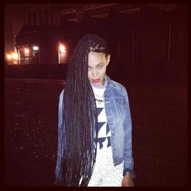 Solange Knowles, wearing waist length individual braids, poses for the camera.