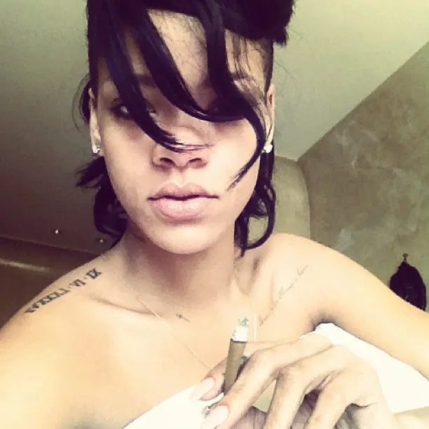 Smoke, anyone? Wrapped in a bed sheet, sex-kitten Rihanna snaps a morning photo of herself, blunt in hand.