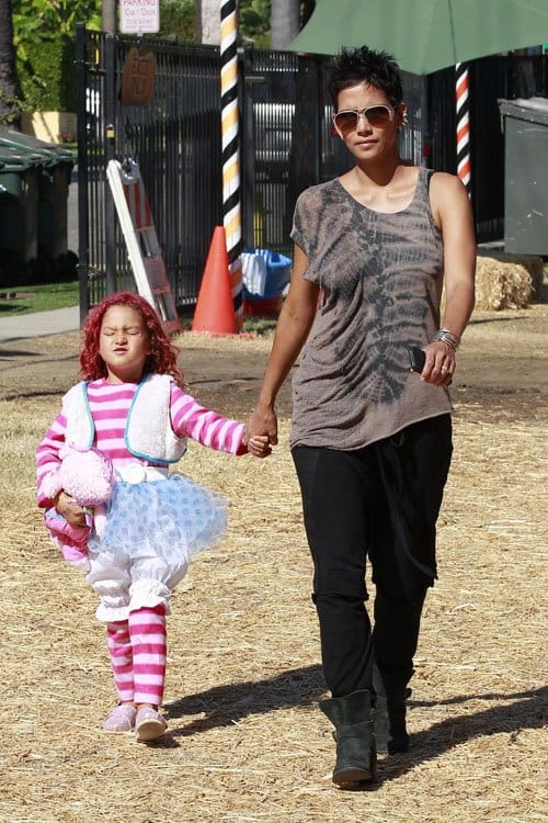 In the true spirit of Halloween, actress Halle Berry decided to take her 4-year-old daughter Nahla out to Mr. Bones Pumpkin Patch in Los Angeles yesterday.The two are seen above together enjoying one of the slides at the pumpkin patch. We’re not too sure who the daughter is supposed to be exactly, but we do love the face painting. Check out some more pictures.