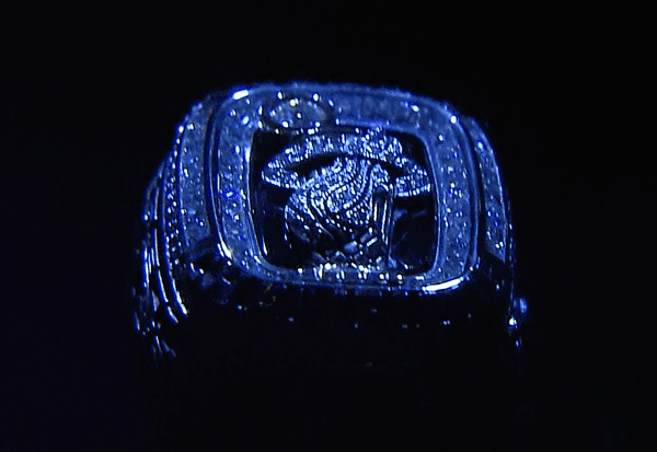 - The other side features the individual’s name and the year 2012. Below the name is the ALL IN Team Championship Trophy. On the base of the trophy are 16 bars in yellow gold that represent each win during the playoffs. Surrounding the onyx trophy is a circle created with the numbers of the 15 players who made up the 2012 championship team. The inside of the ring reads: “FORGED IN THE FIRE BETWEEN A HAMMER AND ANVIL”. Way too much info for you? Of course it is. Peep the clip of the ceremony.