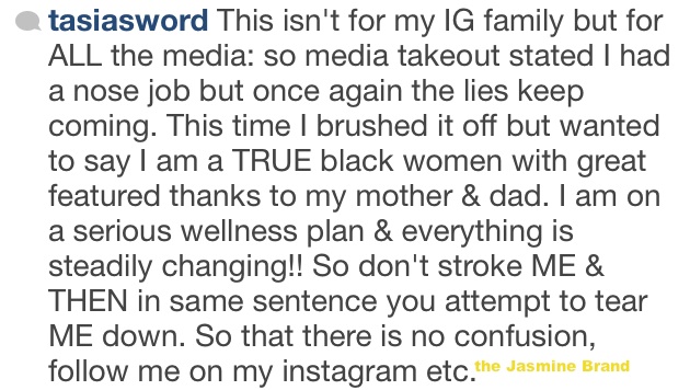 Rumor has it that 28-year-old Fantasia Monique Barrino had some slight work done to her face-a nose job to be specific. I must have missed the rumor, but ‘Tasia wants to set the nose record straight and did so this afternoon on Instagram. In short, she denies adamantly that she’s had cosmetic work done and goes on to say that she is a proud African American woman. She wrote: