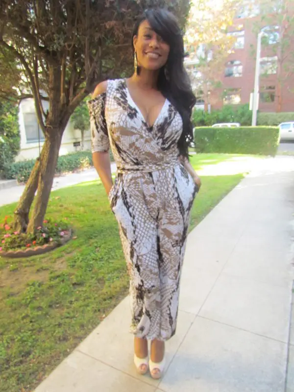 Basketball Wives’ Tami Roman poses, rocking a stylish romper, with waist-length flowing extensions.