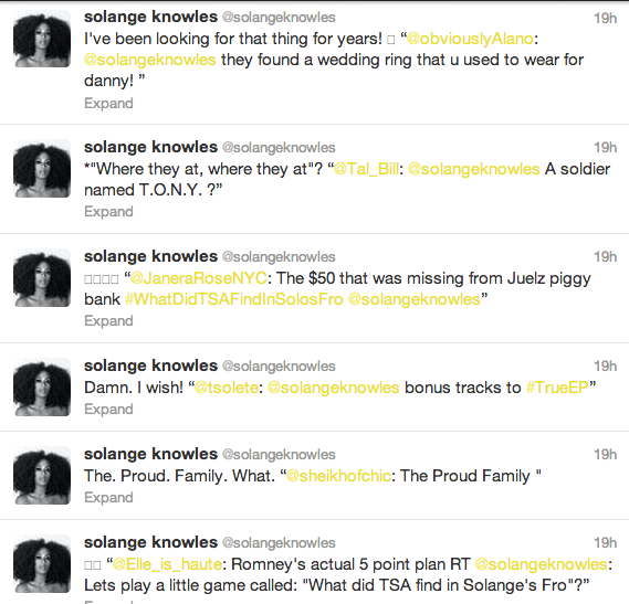 Solange’s followers then tweeted her a number of ‘things’ that TSA found in her hair LOL: