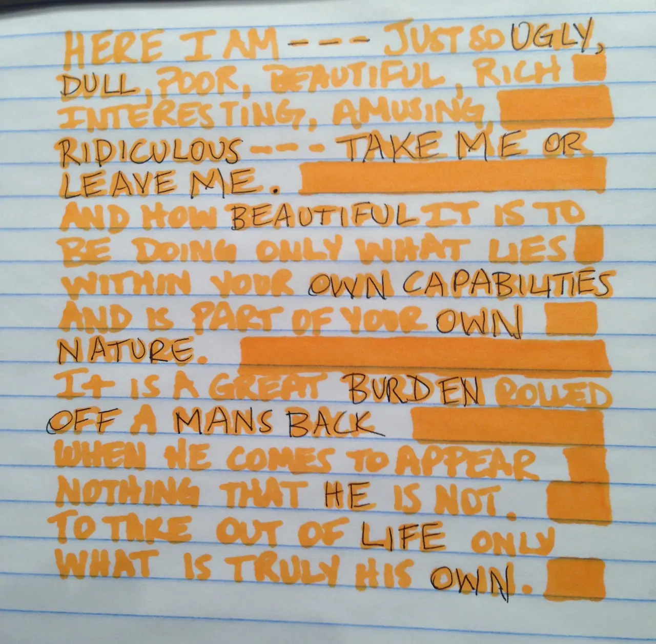 HERE I AM — JUST SO UGLY, DULL, POOR, BEAUTIFUL, RICH, INTERESTING, AMUSING, RIDICULOUS –TAKE ME OR LEAVE ME. AND HOW BEAUTIFUL IT IS TO BE DOING, ONLY WHAT LIES WITHIN YOUR OWN CAPABILITIES AND IS PART OF YOUR OWN NATURE. IT IS A GREAT BURDEN ROLLED OFF A MAN’S BACK WHEN HE COMES TO APPEAR NOTHING THAT HE IS NOT. TO TAKE THAT OUT OF LIFE ONLY WHAT IS TRULY HIS OWN.