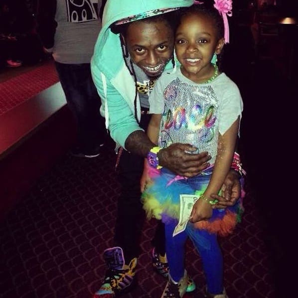 We love cute kids! Especially when they're rocking colorful skirts and such. Lil Wayne poses with an adorable girl during his daughter's roller skating party.