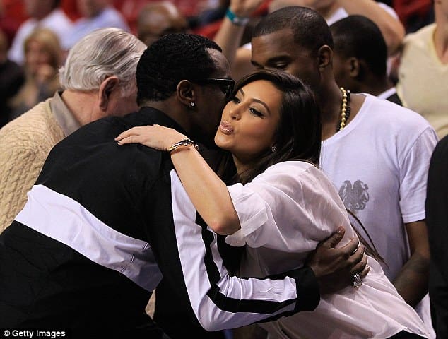 Kim Kardashian greets Diddy courtside, while she checks out the Knicks/Heat game with boyfriend, Kanye West. Gotta love those i-don’t-wanna-mess-up-my-poppin-lip-gloss air kisses.