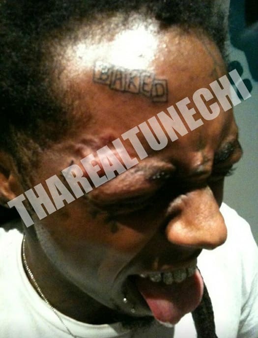 Lil Wayne (real name Dwayne Michael Carter, Jr.) is no stranger to tattoos. So it should come as no surprise that he’s taken his ink addiction, straight to the forehead. His latest tat is the word ‘Baked’. If you’re like me, you assumed he was referring to his weed addiction (don’t judge me, I’m not too hip), but not quite.