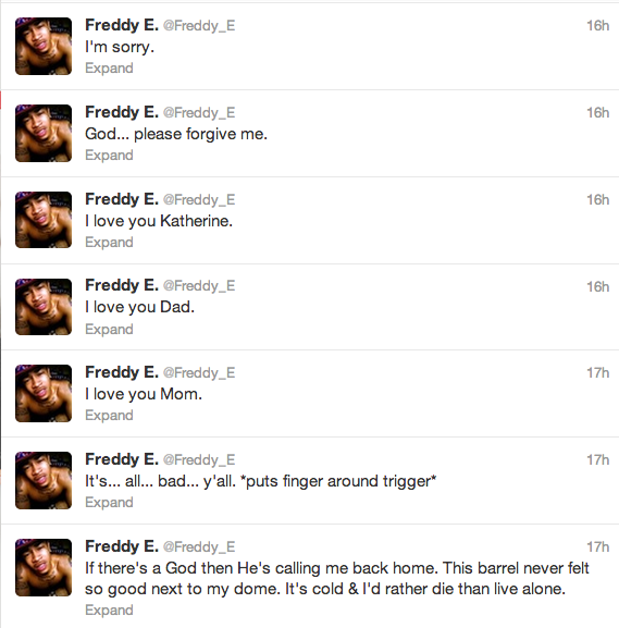 Very tragic news for an up and coming artist named, Freddy E (real name Frederick Eugene Buhl). According to reports and his twitter account, early Sunday morning, he committed suicide. At some point, Freddy E and Honey Cocaine (who are both signed to Tyga’s record label) had a romantic relationship that ended. There have been conflicting reports, most noting that the Los Angeles native took his life because of his failed relationship with Honey Cocaine. Before committing suicide, he wrote: