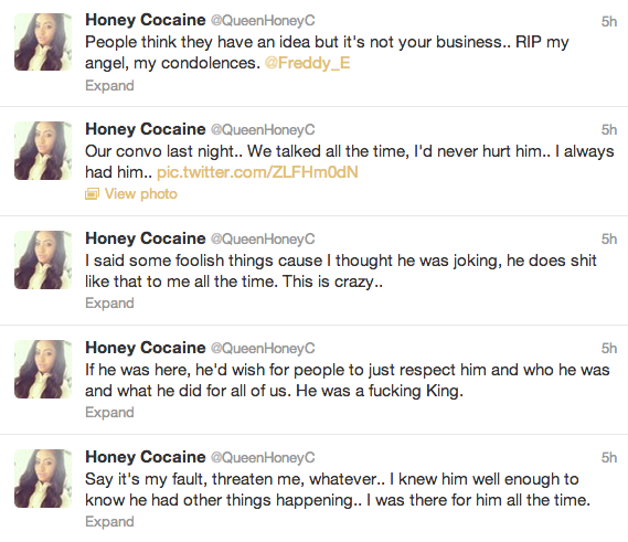 Meanwhile, Honey Cocaine has responded, sending her condolences and disputing reports that she is the reason Freddy took his life.
