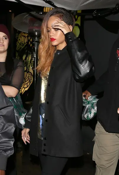 Rain doesn’t even stop this party girl! Rihanna and her shaved side were spotted leaving a Hollywood club.