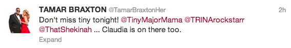 It appears that some tension is brewing between two new, TV colleagues. This week, an episode of ‘Tiny Tonight‘ aired, a new late night talk show, featuring Tiny and her friends, rapper Trina, TV personality Claudia Jordan, singer/reality star Tamar Braxton and BFF Shekinah. So who from the new show seems to be sorta-kinda beefin’? From the looks of things, Tamar and Claudia. Apparently, during an episode, the two had a difference of opinion. And while that doesn’t seem like such a big deal, some slight shade was thrown on twitter while the show aired. We can’t tell exactly who started it, but check out the exchange below.