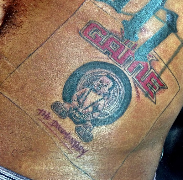 And if that’s not enough….there’s more pain. He also got ‘The Documentary’ album tatted on him, with his son Harlem on the cover, writing: