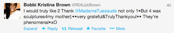 It’s no secret that Bobbi Kristina is not a fan of the book that her grandmother, Cissy Houston, has penned about her late mother. Last week, she let the twitter world know just how she felt. And while we assume she’s still upset with her grandmother, I’m sure this is a tough time for her. This week, marks the one year anniversary of Whitney Houston’s death. To honor her legacy, Madame Tussauds unveiled four wax figures of Whitney and apparently this is a huge deal because this is the first time four figures of the same individual have been simultaneously. Close members of Whitney’s family were present (Gary, Pat and Cissy) at the unveiling, EXCEPT Bobbi Kristina. We’re not sure why she was absent, but she did thank Madame Tussaunds publicly.