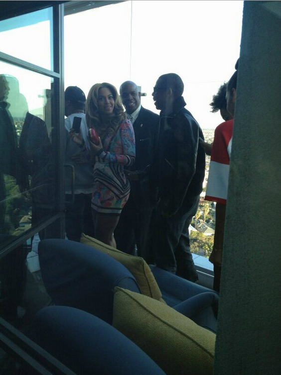 Since it was a Roc Nation shin-dig, it was expected that boss Jay-Z would attend, but club goers were pleasantly surprised when Mrs. Beyonce Knowles-Carter showed up for Roc Nation’s Brunch. The room was bubbling over, literally, when Beyonce showed up, accompanied by her big (and attractive body-guard), hubby and sister Solange. Rocking a fitted, long-sleeve, above the knee printed dress, Bey was all smiles as she took a few candid shots with celeb and industry friends. Peep some of the candids.