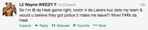 We can’t figure out if the Police Department, the Miami Heat or the NBA who has no love for rapper Lil Wayne (real name Dwayne Michael Carter, Jr.). On Sunday, the 30-year-old Young Money rapper attended the Miami Heat vs. LA Lakers game. All was well court-side, until he was removed from the game. According to Tunechi, the police ‘made him leave’. He briefly recounted the story on twitter, writing: