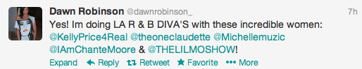 Here’s the quick and dirty! The spinoff will follow musical careers and personal lives of Kelly Price, Chante Moore, Lil Mo, Miche’le, Dawn Robinson of En Vogue and Claudette Ortiz of City High. The show will begin production in Los Angeles this month and is scheduled to premiere in late 2013. Over eight episodes we will follow the ladies as they seek to reestablish their careers and mend issues in their personal lives. New cast members Dawn Robinson & Lil’ Mo tweeted her excitement: