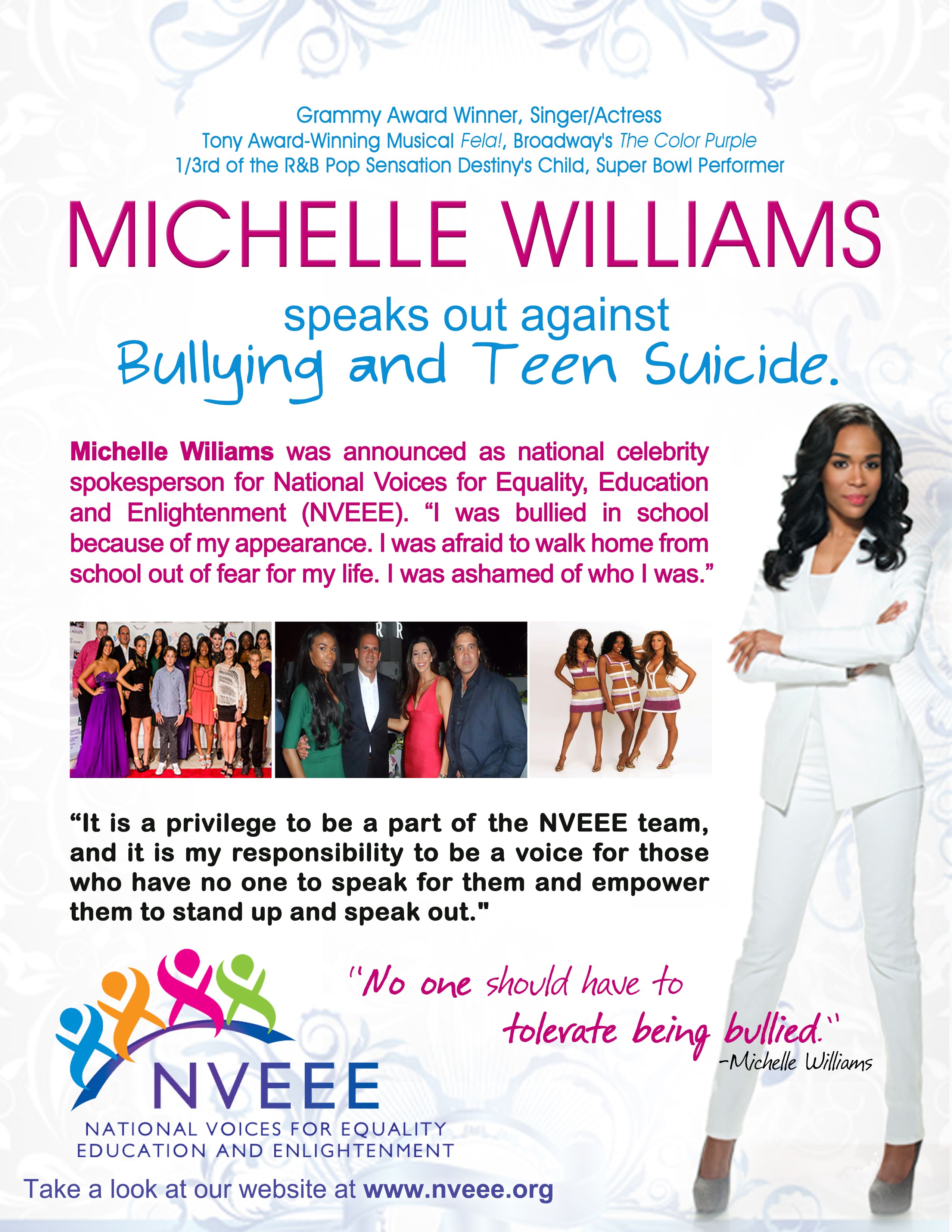 And in other Michelle news, she is the new celebrity spokesperson for the National Voices for Equality Education & Enlightenment (NVEEE). Michelle involved her motivation in lending her celebrity for this cause: