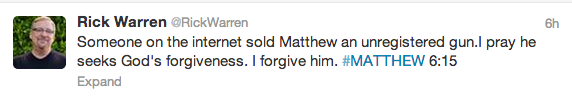 My prayers go out to the Warren Family I know this is a difficult time for them. I am thankful that they have forgiven whoever sold him the gun because even if the gun was registered to him he still could have did the same thing. I think that depression is over looked because people say just get over whatever you are going through but that is hard. I have read that Matthew had been battling with this illness for a long time.