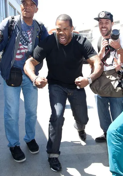 Rapper Busta Rhymes flexes his muscles for the cameras.