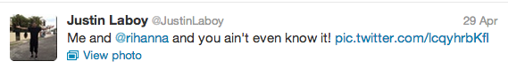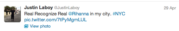 Looks like a few innocent (or at least we assume they are) photos of Rihanna and a handsome young man have hit the net, causing folk to wonder what’s REALLY going on with Chris Brown and RiRi. This week, photos of Rihanna and a dude by the name of Justin have grown legs. From what we hear (and stalk), after her ‘Diamonds World Tour’ stop in New Jersey, Rihanna met Justin at an after-party and took a few photos above. Justin, as most of us would do, later posted the pictures on twitter, excitingly telling the world: