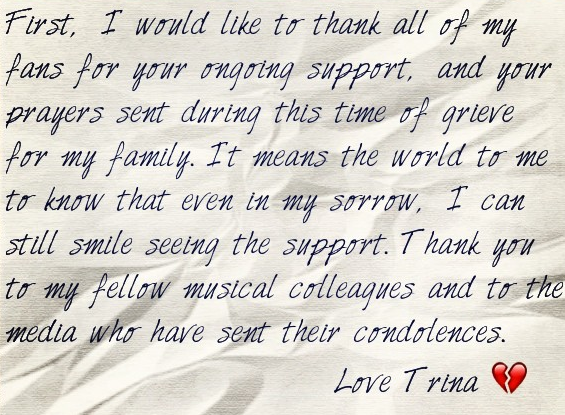 First, I would like to thank all of my fans for your ongoing support, and your prayers sent during this time of grieve (grief) for my family. It means the world to me to know that even in my sorrow, I can still smile seeing the support. Thank you to my fellow musical colleagues and to the media who have sent their condolences. Love Trina.