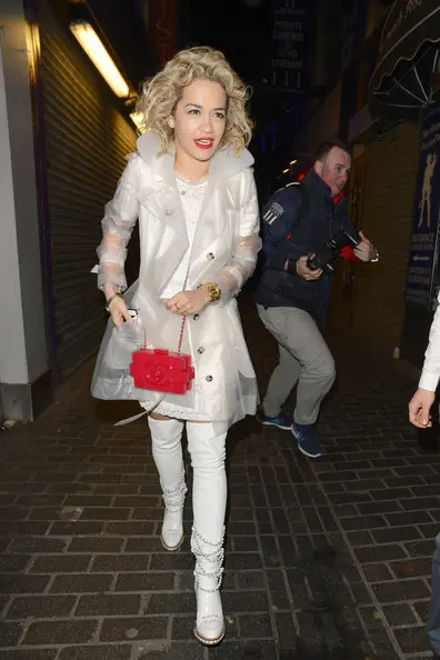 British singer Rita Ora qas seen in London attending a friends birthday party. The Roc Nation signee donned a clear trenchcoat and thigh chained Chanel boots.