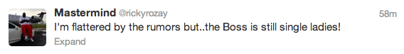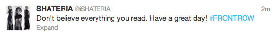 These two were growing on me, but if the rumors are true, we’re sure they’ll bounce back. Besides, we’re told that Front Row is financed largely by Ricky, not to mention that these two have been dating for almost four years. Anywho, click here for the full story. P.S. Any other celeb women that we’d like to pair Mr. Rozay with? I have a suggestion, it’s one of his ex’s and she’d KILL me if I wrote her name :) P.S. Word travels fast, Shateria responded on twitter: