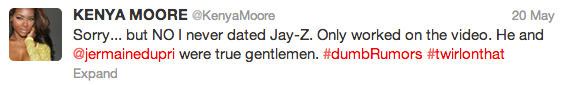 Not quite. Recently, Kenya posted an older picture of her and Mr.Carter together. If you remember, Kenya portrayed Jay-Z’s love interest in the video for Jermaine Dupri’s 1998 hit, ‘Money Aint’ A Thang.’ Twittersphere blew up and rumors and began to swirl about the pair. The former Miss USA took to Twitter to dispel the rumors: