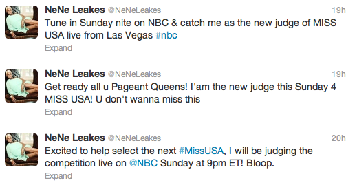 Nene Leakes has scored herself another gig–this time, as a judge. The RHOA star will be joining the judges panel for the 2013 Miss USA competition. Leakes confirmed her new gig on Twitter: