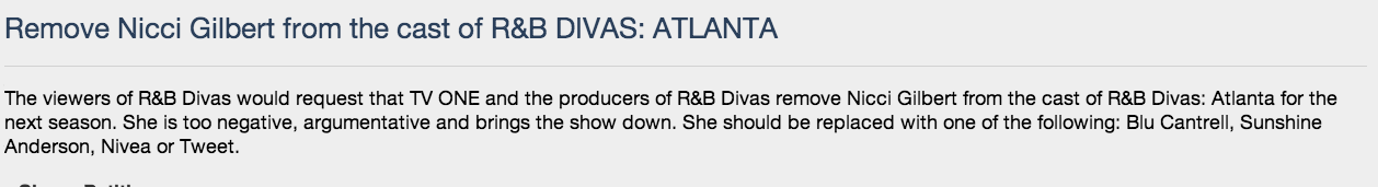 I agree with “Khloe”. Nicci is the one that is always getting into it with one of the ladies. I think Nicci should go before this show turn into another Basketball Wives and we all know how that show is. Ain’t no grown woman got time to be fighting. I like the idea of sisterhood and I think that Angie Stone is really trying to bring that to the show as well as LaTocha. If Nicci leave it will be a better show because I didn’t like how Nicci lied on Syleena throughout the show and then had the nerve to be in Syleena workout video but would not sign the paperwork so the video could be published. Nicci is hateful & and a hater and do not want to see anybody on top but her. Throughout the show it showed her always talking negative about Syleena to the other ladies or whoever would listen but you never heard Syleena going from woman to woman talking about Nicci. Also, I liked the fact how Syleena put her feelings aside for Nicci and went on stage to save her at the AIDS charity event with her song. I am TEAM SYLEENA & THE PRODUCER! I want Nicci off the show so I can see a sisterhood show and not another show showing black women fighting and arguing all the time. Where is the link to the petition so I can sign it.